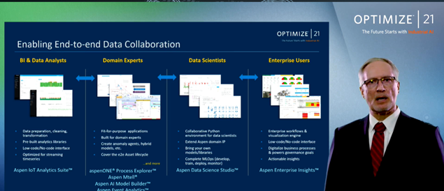 Bill Scudder演講的主旨是,AspenTech通過(guò)Aspen AIoT Hub提供一個(gè)端到端的、適合特定用途的解決方案,而不是由多個(gè)第三方提供的通用工具和服務(wù)的集合。Aspen AIoT Hub是可擴(kuò)展的、安全且強(qiáng)大的,可以滿足組織的大量需求、提高生產(chǎn)力、應(yīng)對(duì)趨勢(shì)變化。他通過(guò)一個(gè)詳細(xì)的用例,說(shuō)明了Aspen AIoT Hub支持的各種應(yīng)用和功能如何幫助整個(gè)工業(yè)組織中的不同角色——數(shù)據(jù)分析師、過(guò)程工程師、數(shù)據(jù)科學(xué)家和企業(yè)用戶——利用工業(yè)數(shù)據(jù)的力量和價(jià)值。